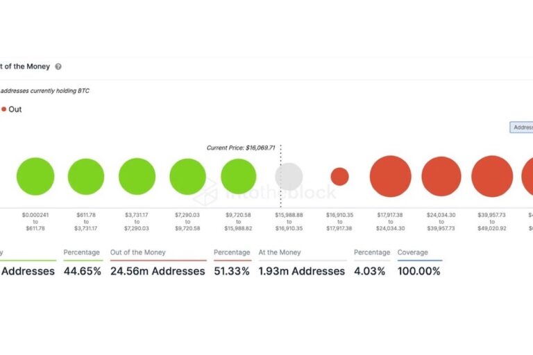 IntoTheBlockは、平均購入価格がビットコインの現在の価格1万6067ドルを上回っているアドレスを、損失(アウト・オブ・ザ・マネー)となっているアドレスと定義した。