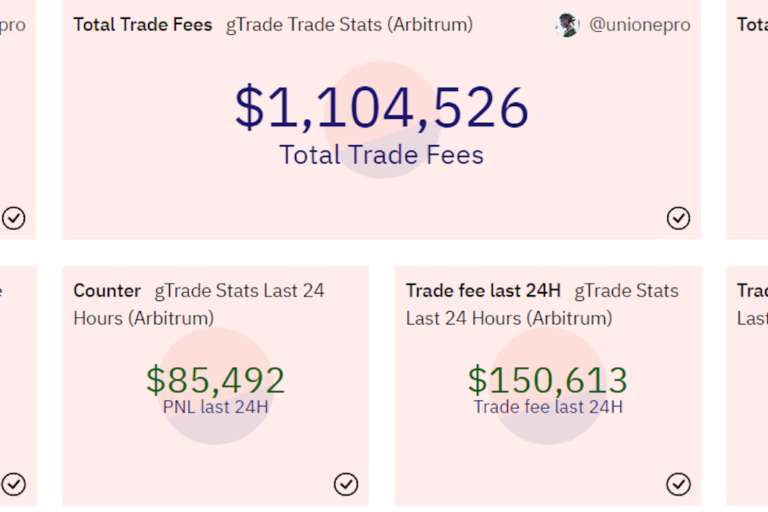 Dune Analyticsのデータは、アービトラムでの15億ドルの取引がプラットフォームに流動性を提供するユーザーに対して110万ドル(約1億4300万円)の手数料を生み出し、GNSトークンの有用性を高めていることを示している。