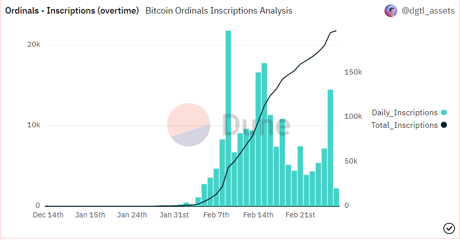 これまでに、Ordinals上の個々のトークンを表す用語であるユニークインスクリプションが19万7000件以上実行されたことが、Dune Analyticsのデータで示されている。