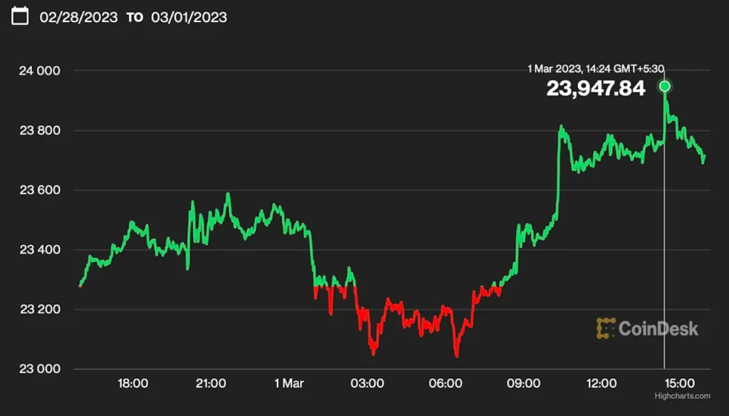 米CoinDeskのデータによると、時価総額でトップの暗号資産(仮想通貨)であるBTCは、2万3000ドルから2万4000ドル近くまで4%跳ね上がった後、2万3700ドルまでわずかに戻った。メジャー通貨に対するグリーンバックの価値を示すドル指数は0.5%下落し、104.36になった。