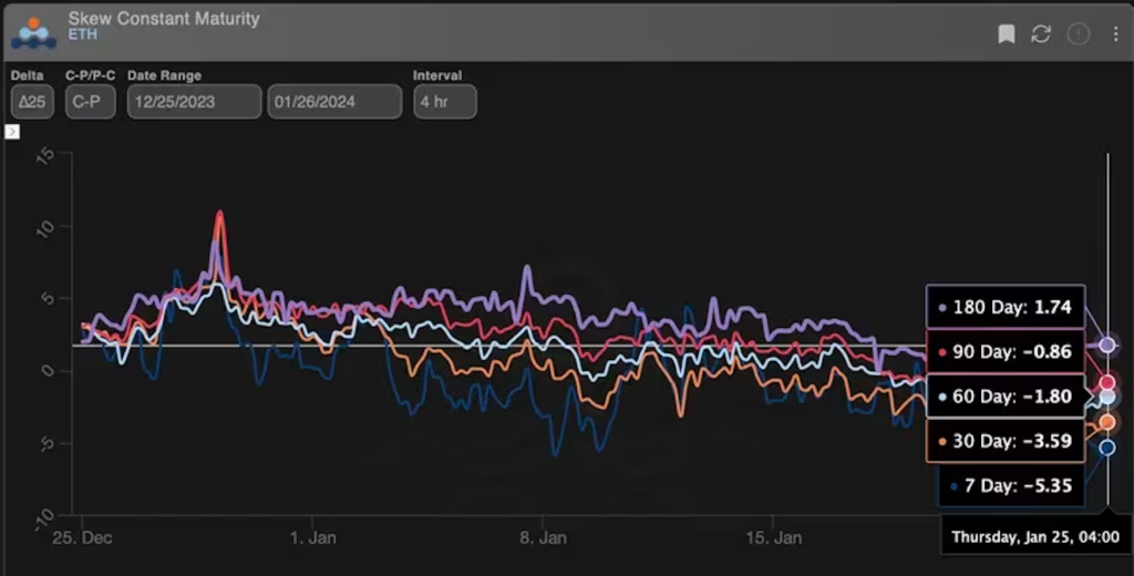 ETHの1週間コール-プット・スキュー(7日後に期限を迎えるプットに対するコールの需要を示す指標)は、1月24日にほぼ-8まで低下し、過去3カ月で最低となった。これは、イーサリアムの価格が下落するとの見方が優勢であることを示している。