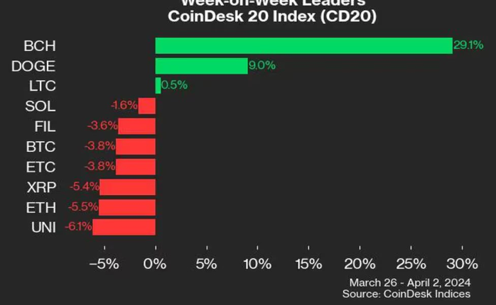 CoinDesk 20の構成銘柄のうち、1週間前と比べて上昇して終了したのは3つだけだった。ビットコインキャッシュ(BCH)が29%、ドージコイン(DOGE)が9%、ライトコイン(LTC)が0.5%それぞれ上昇した。ビットコインキャッシュは1年で4倍以上値上がりしたが、依然として時価総額はビットコイン(BTC)の1%未満にとどまっている。