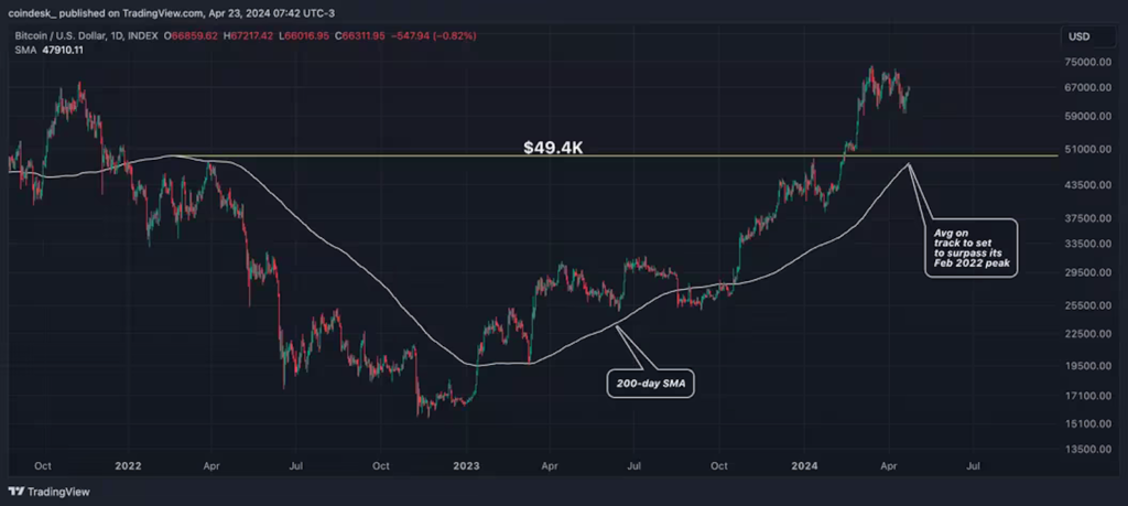 - ビットコインの200日単純移動平均は、2022年2月のピークである4万9452ドルに挑戦する勢いだ。