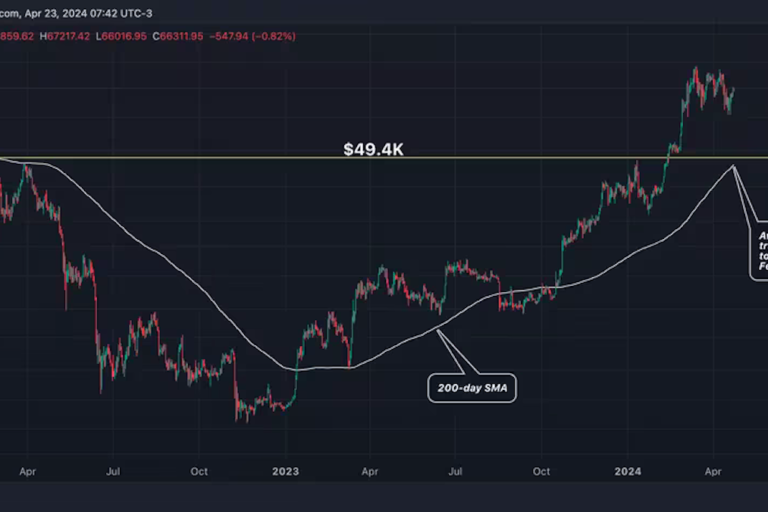 現在、長期トレンドの重要なバロメーターである同平均線も、強気の勢いを示すように急上昇しており、2022年2月の4万9452ドルという過去のピークを上回る勢いのようだ。記事執筆時点では、ビットコインは6万6200ドル、200日平均は4万7909ドルで取引されている。