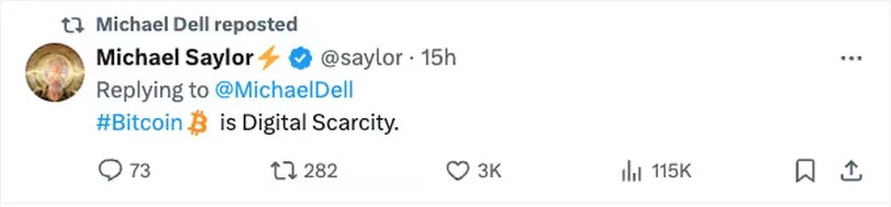 事の発端は、デル氏が20日に「希少性が価値を生む」と投稿したことだった。これに対し、マイクロストラテジー(MicroStrategy)のエグゼクティブ・チェアマンであるセイラー氏が「ビットコインはデジタル希少性だ」とリプライし、デル氏はそれをリポストとした。