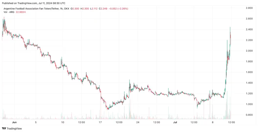 サッカーのコパ・アメリカでディフェンディングチャンピオンのアルゼンチン代表が決勝に進出し、同国のファン向けトークン「ARG」の時価総額が2倍以上になった。