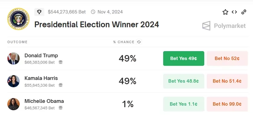 |原文:Kamala Harris, Donald Trump Tied on Polymarket on Who Will Be The Next U.S. President