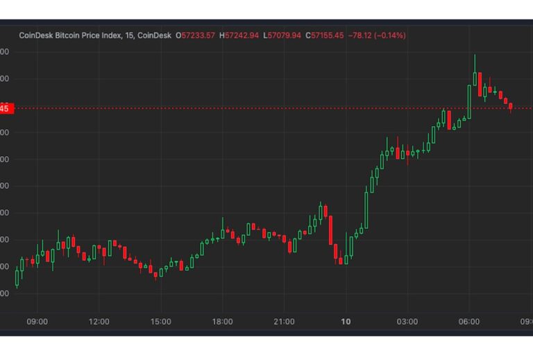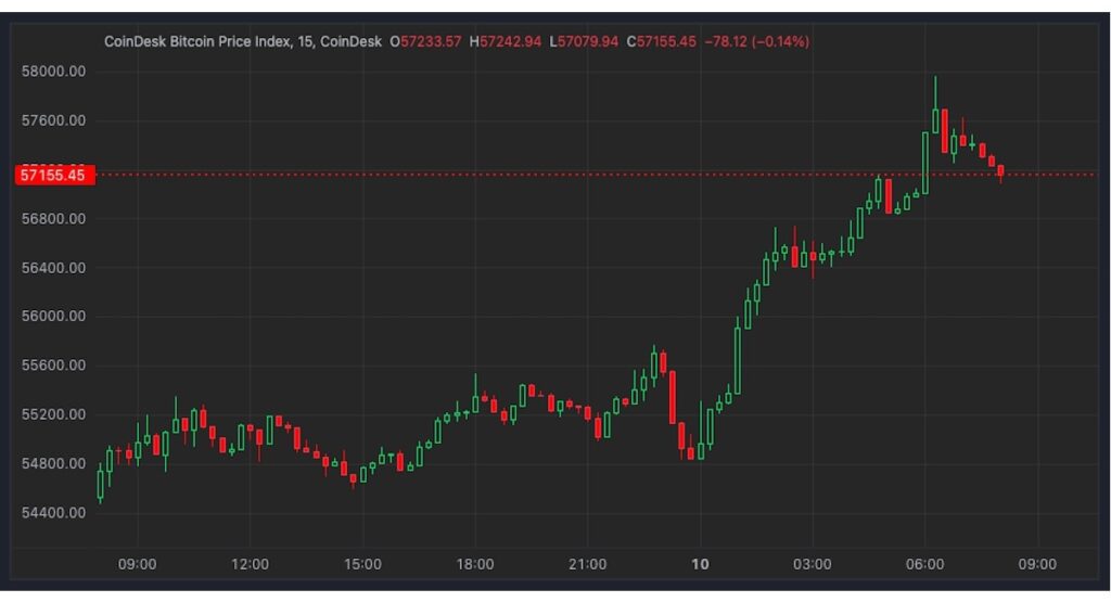 当記事執筆時点、ビットコインは5万7000ドルをわずかに上回る水準で取引されており、24時間で5%上昇。より広範な市場指であるCoinDesk 20 Index(CD20)の4.2%上昇を上回っている。イーサリアム(ETH)は、ビットコインやCD20と比較すると依然として苦戦しており、3%上昇の2341ドル。