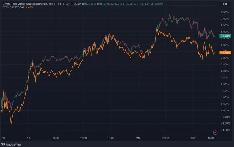 ビットコインとイーサリアム(ETH)を除く、上位125の暗号資産をの時価総額を追跡する指数、Total3はTradingViewを見ると、FRBの金利引下げ後、当記事執筆時点までに5.68%上昇している。一方、ビットコインは4.4%上昇。