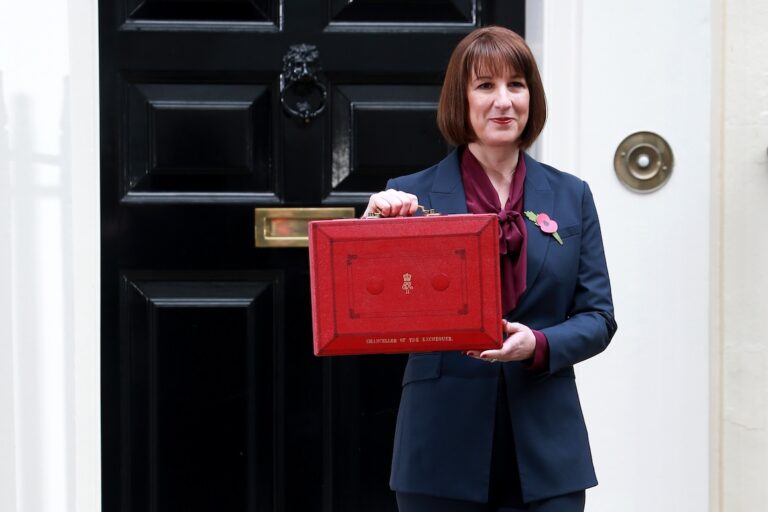|画像:2024年10月30日、予算案提出を前に官邸前でポーズを取るイギリスのレイチェル・リーブス財務大臣。(Shutterstock)