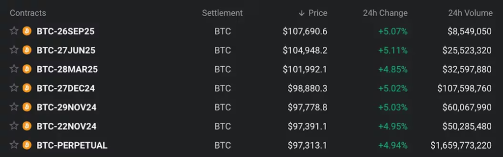 - 2025年3月、6月、9月に満期を迎えるデリビットのビットコイン先物は、10万ドルを上回る価格で取引されている。