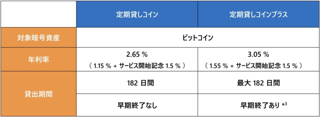 同サービスは、「定期貸しコイン」と「定期貸しコインプラス」の2つのプランを提供する。基本となる「定期貸しコイン」は年利2.65%(基本利率1.15%+開始記念特典1.5%)で、貸出期間中の早期終了がない安定的な運用が特徴。一方の「定期貸しコインプラス」は年利3.05%(基本利率1.55%+開始記念特典1.5%)と高利回りを実現するが、貸出が早期終了する可能性がある。