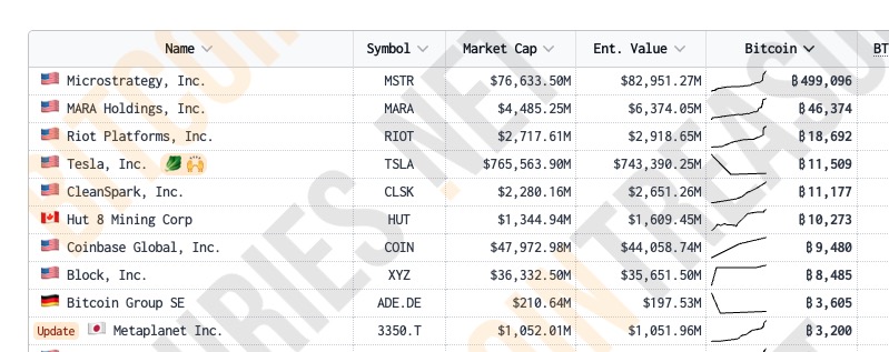 ビットコイン保有企業のランキングを提供するBitcoinTreasuriesによると、今回の追加購入でメタプラネットはBTC保有数で世界10位に浮上した。