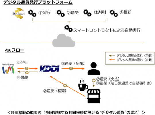 基盤にはディーカレットが構築したブロックチェーンを用いる。資金移動業の登録業社であるウェブマネーがデジタル通貨を発行し、KDDIが配布する。実験には関係者のみが参加し、カフェで決済する。ブロックチェーンの特性を活かしたダイナミックプライシングやリアルタイム決済の検証を行う。