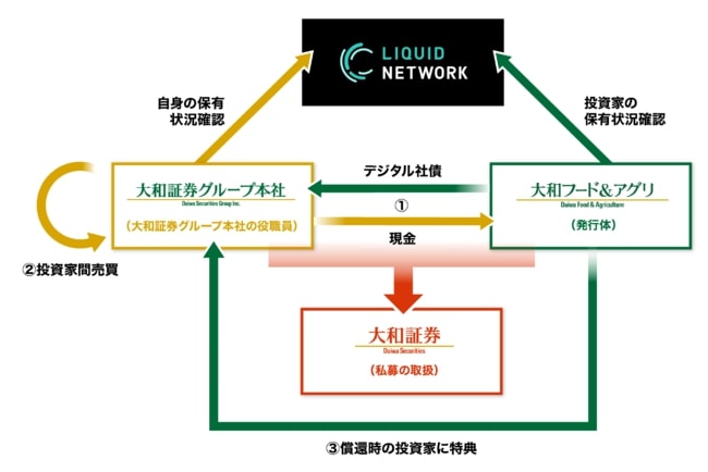 「大和証券デジタル社債」に関しては、投資家である大和証券グループ本社は、Fintertechが前払式支払手段としてLiquid Network上に発行したデジタルコインを対価として払込みを行っている。この社債の利払い、買入消却でも対価はデジタルコインとなる。大和証券グループ本社などによると、ブロックチェーン上に記録された前払式支払手段を対価とした、有価証券の発行や買入消却は日本で初めてという。