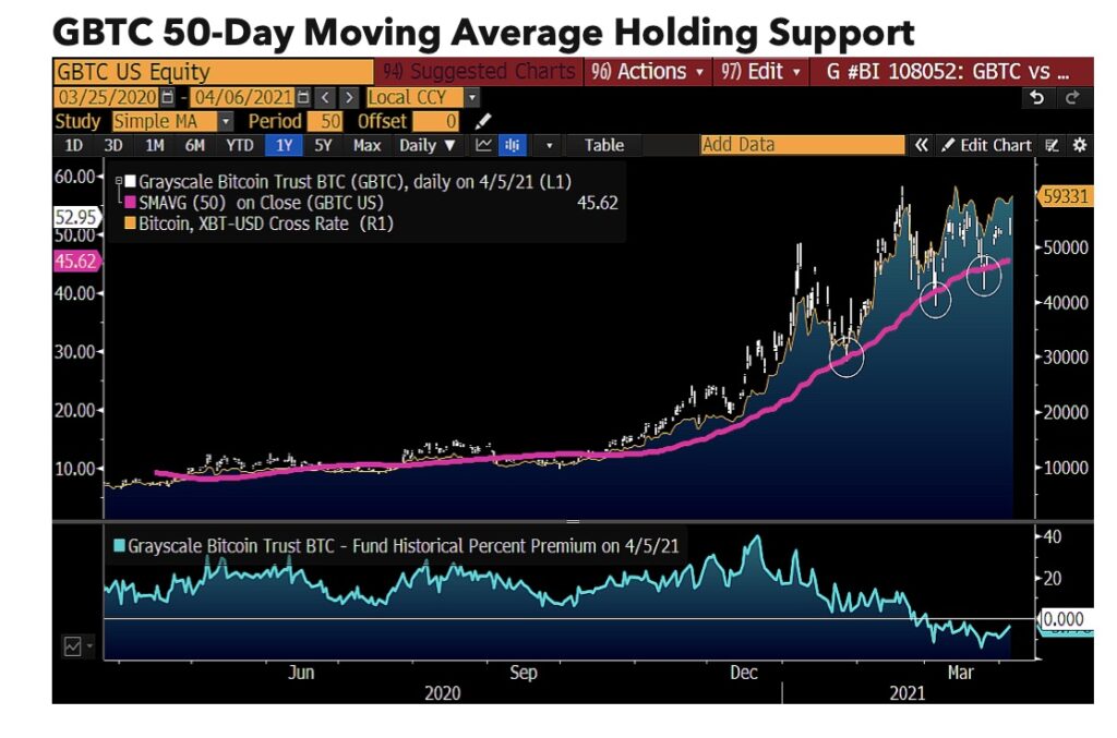 またレポートは、機関投資家に人気のグレイスケール・ビットコイン・トラスト(GBTC)が最近、ビットコインの現物価格を下回る水準で取引されていることは、米国でのビットコインETF(上場投資信託)承認に向けた期待の高まりの結果としている。GBTCは依然として、これまでバイヤーを引きつけてきた50日移動平均支持線を上回る水準で取引されている。