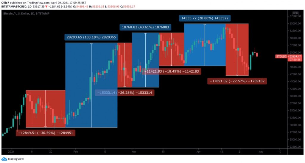2021年1月1日以降、ビットコイン価格には大きな価格変動が7回あった。そのうち4回は下降局面(赤枠)で平均25.94%の下落。残り3回は上昇局面(青枠)で平均58.36%の上昇となっている。