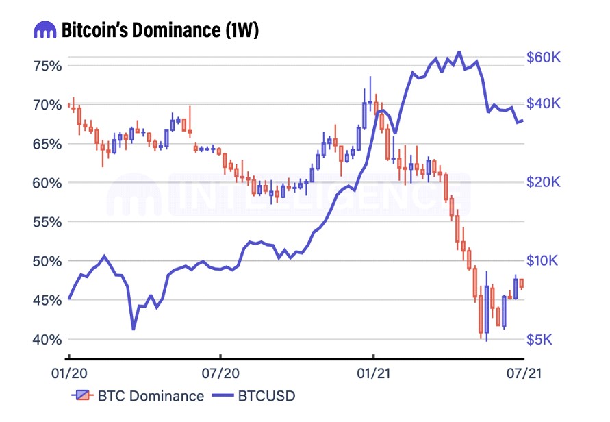 ビットコインが6%マイナスだったのに対して、トップ25のアルトコインは平均22.5%のマイナス。ビットコインの時価総額の暗号資産全体における割合(ドミナンス)は大きく回復し、50%に迫っている。弱気相場におけるビットコイン頼みの傾向が今回も浮き彫りになった。