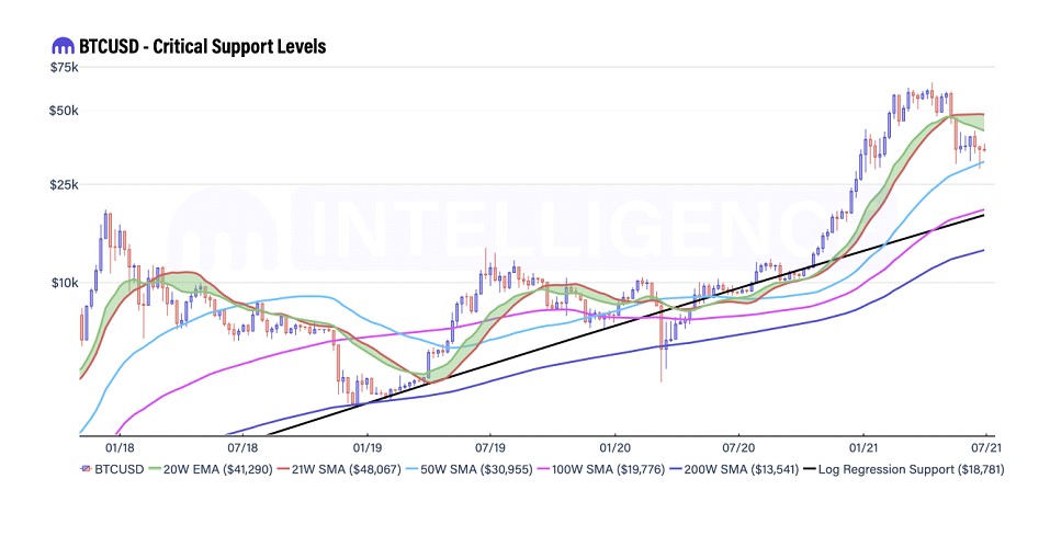 2011年まで遡って観察すると、20週指数平滑移動平均線(EMA)と21週単純移動平均線(SMA)が、ビットコインの重要なサポートとして機能してきたことが分かる。