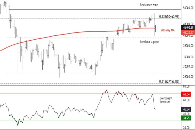 ビットコイン(BTC)は、7日の急激な下落を経て、4万6000ドルの200日移動平均線付近で横ばいとなっている。24時間では約8%下落。