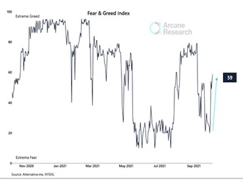 「3週間の恐怖の後、ビットコイン価格が上昇した10月1日に指数は急上昇し、現在は貪欲な市場心理を示している」とアーケーン・リサーチ(Arcane Research)は5日、レポートに記した。