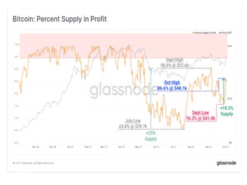 グラスノード(Glassnode)がまとめたブロックチェーンデータによると、流通しているビットコインの約10%が未実現利益(取得コストを上回る水準)に戻ったという。