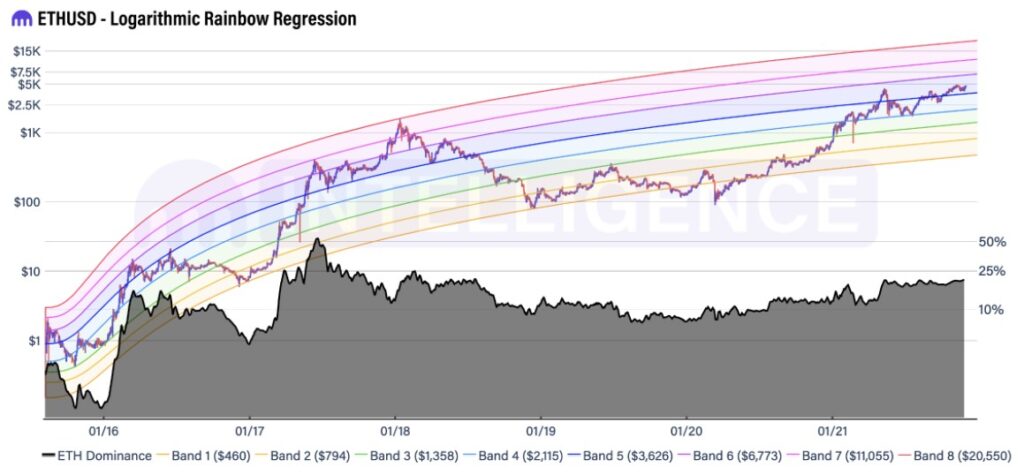 現在、暗号資産市場全体に占めるイーサリアムのシェアが増加し始めている。11月の価格上昇と合わせて、イーサリアム有利のトレンドが続けば、6000ドル突破が見えてくるかもしれない。