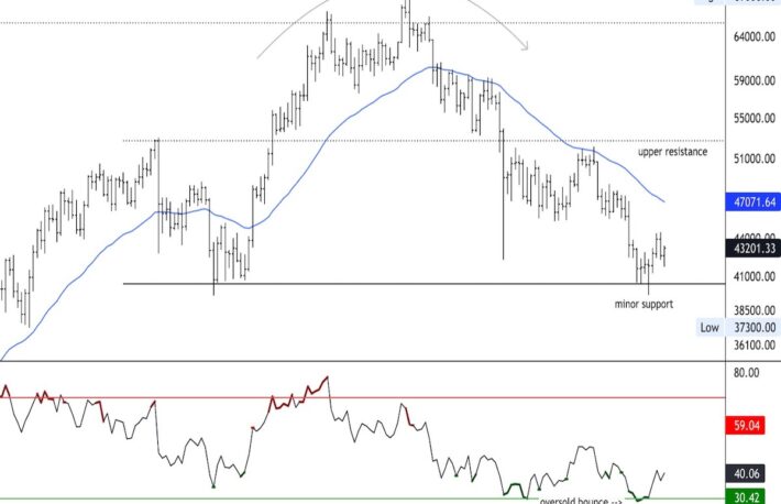 サポートは4万ドル付近にあり、短期的な下落を制限する可能性がある。一方で4万5000ドル〜4万7000ドルのレジスタンスに向けた上昇も限られるだろう。