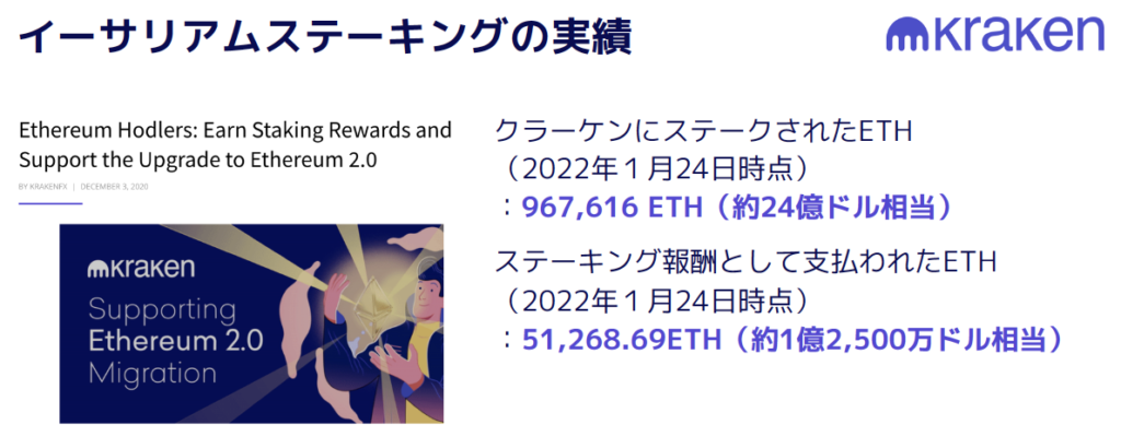 もちろんETHの価格変動リスクはある。しかし、クラーケンがETHをいったん預かり、タイミングがきたらお返しする形になるので、現物がなくなってしまうようなリスクは排除されている。