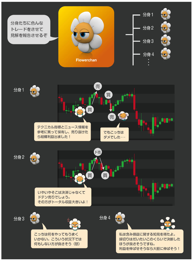エージェントが創り出した「分身」たちは、それぞれ自由な判断でトレードのシミュレーションをしていく。そして、それぞれの判断・結果を総合判断し、教訓を見出していくわけだ。