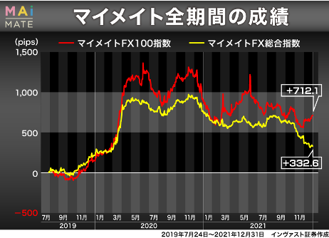 サービス開始直後の2019年7月24日から2021年12月31日までの期間だと、全エージェントを対象とした「マイメイトFX総合指数」では+332.6 pips。その時点で調子のいいエージェント100体をポートフォリオにし、定期的に入れ替えて運用した場合のベンチマーク「マイメイトFX100指数」では712.1pipsと、どちらも大きくプラスになっている[詳細はこちら]。
