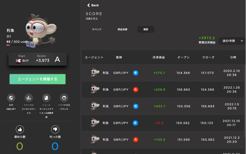 エージェントの育成にユーザーが関与できる点は、エージェントが前の週にした判断を週1回「ほめる」か「しかる」かするところだ。ほめてもよし、叱ってもよし、だが育て方次第では、強気なエージェントになることもあれば、トレードをほとんどしない弱気なエージェントに育ってしまうこともあるようだ。