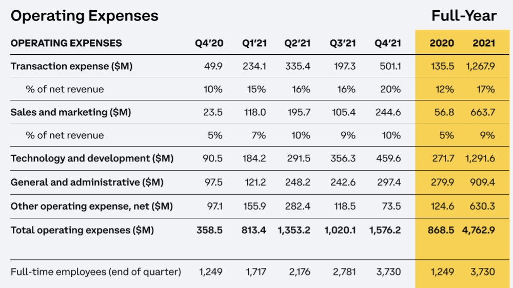 コインベースの収益は過去1年で大幅に増加しているため、同社が販売・マーケティングに費やすことのできる予算が増えるのは驚くことではない。直近の4Qでは同費用は約5億ドルで、前年4Qは4990万ドルだった。