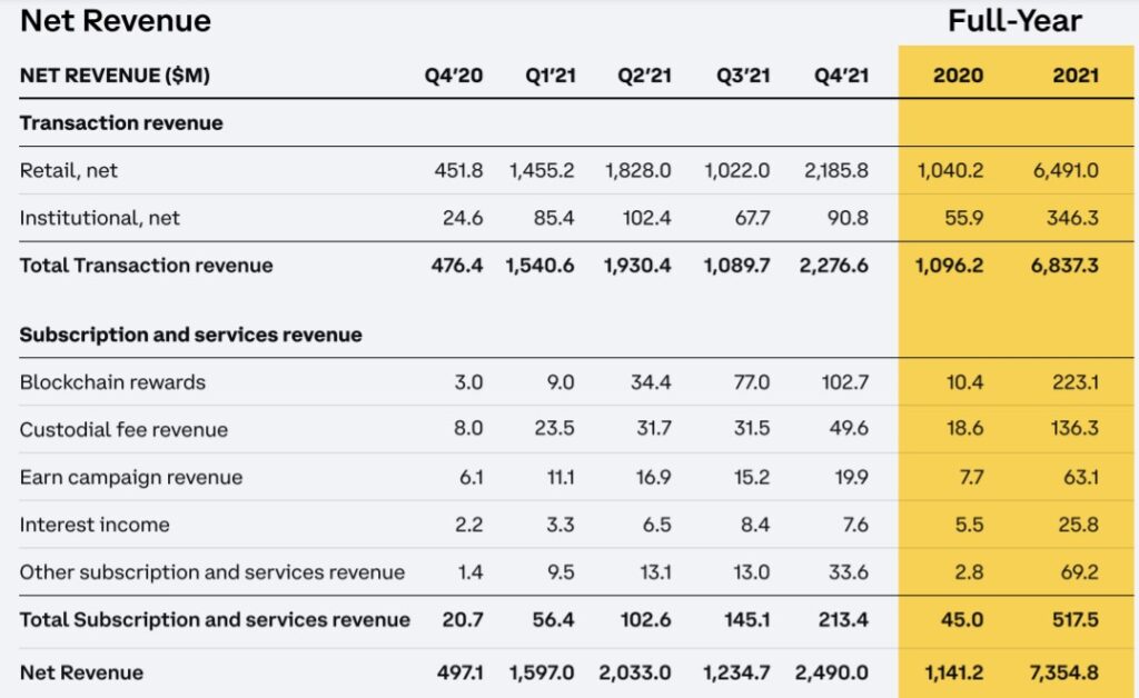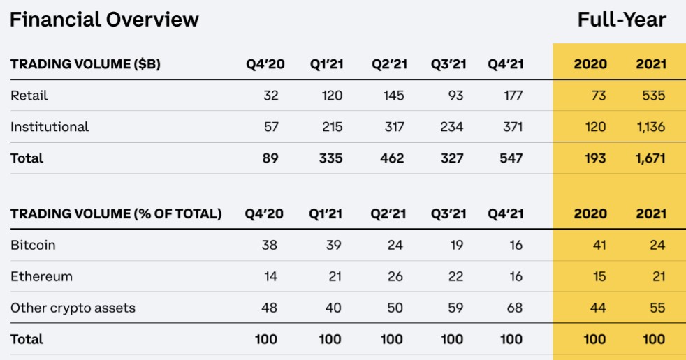 通年で見ると、コインベースが2021年に稼いだ機関投資家の取引収益は、3.463億ドルで、前年の5590万ドルから6倍以上となった。