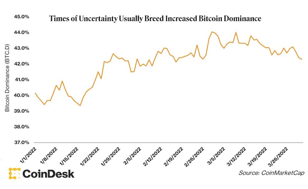 ビットコインのドミナンス(暗号資産全体の時価総額に対するビットコインの時価総額の比率)も見てみよう。不確実性の高い時代には、ビットコインのドミナンスが上昇する傾向があり、2022年に入ってからはそれが顕著に表れている。暗号資産にとっては、奇妙で厳しい四半期となった。