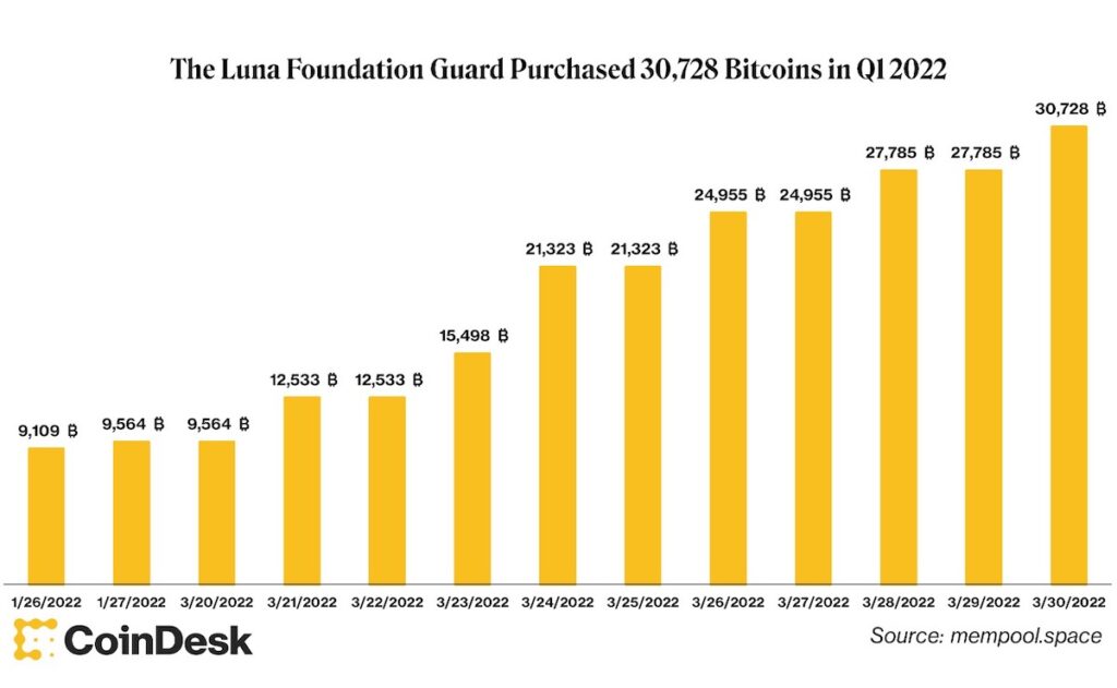 3月25日、ビットコインは4万4000ドルで週末を迎えたが、28日に突然、4万8000ドルまで上昇した。この上昇は、Luna Foundation Guard(LFG)がステーブルコイン「terraUSD(UST)」の裏付け資産として最大100億ドル相当のビットコイン購入を計画していることが一因となった。