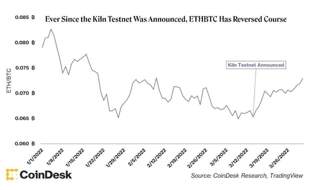 イーサリアムの上昇要因は3月14日、テストネット「Kiln」でプルーフ・オブ・ステーク(PoS)に移行するための大型アップデート「The Merge」に成功したこと。2015年から進められてきたPoSへの移行作業が最終段階を迎えたことを示した。