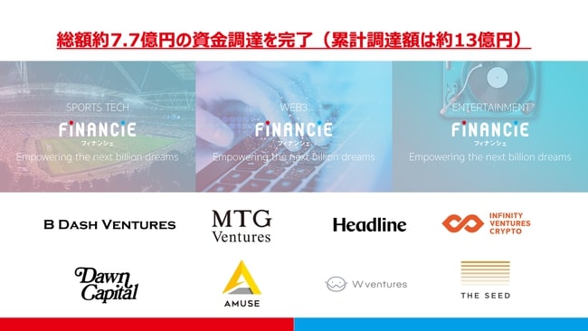 フィナンシェが8月5日に発表した内容によると、今回の調達ラウンドには既存株主のB Dash ベンチャーズの他に、MTG Ventures、Headline Asia、(Infinity Ventures Crypto)、アミューズ、Dawn Capital、W venturesなどが参画。フィナンシェが調達した資金は13億円に達した。
