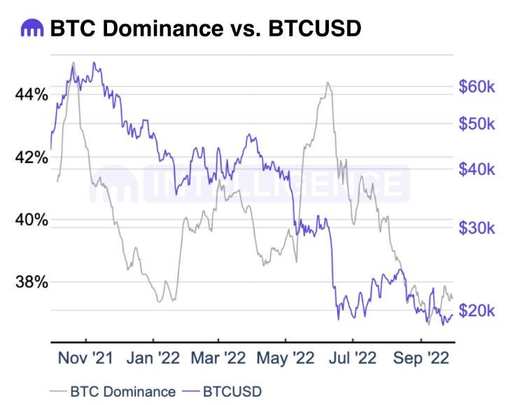 また、過去の傾向では相場の下落局面においてはBTCのドミナンス(暗号資産マーケット全体に対する時価総額の割合)は上昇しやすいが、2022年9月におけるBTCのドミナンスは37%から38%へとわずかに上昇するにとどまった。