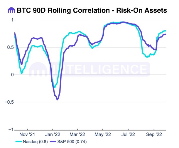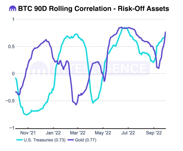 2022年9月のビットコインは、株式などのリスクオン資産と米国債や金などのリスクオフ資産それぞれとの正の相関の高まりが見られた。