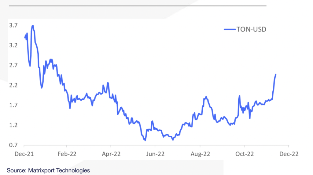 暗号資産サービスプロバイダー、Matrixportのリサーチ&戦略責任者マーカス・ティーレン(Markus Thielen)氏は12月15日、顧客向けのメモの中で 「電話番号を登録しなくてもアカウントを作成することができるテレグラムアプリの最新アップデートが明らかになったことで、Toncoinは過去1週間で39.3%上昇。ユーザーはFragmentに出品されている番号を使ってログインすることで、匿名性を維持することができる」と述べた。