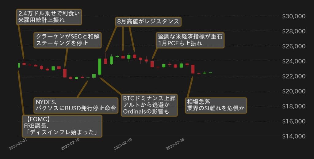 9日には、クラーケンが米証券取引法違反の疑いのあったステーキングサービスを、米証券取引委員会(SEC)と和解し罰金を支払った上で停止し、アルトコインを中心に売りが加速し、BTCも連れ安で2.2万ドルを割った。その後も、SECがバイナンスUSD(BUSD)を巡って発行体のパクソスに証券法違反の疑いを告げる通知を送っていたことが明らかとなったり、NY州金融サービス局(NYDFS)がパクソスにBUSDの発行禁止命令を発したりと、規制加速が業界の逆風となったが、SECの管轄外であるBTCへの逃避の動きや、ビットコインの最小単位である1satsにNFTを記録するプロトコルOrdinalsの影響で、BTC相場は反発した。