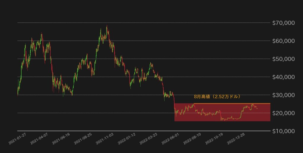 こうした懸念を加速させるように、S&Pグローバルの2月の米PMI改善や、1月の個人消費支出(PCE)価格指数の上昇が重なり、BTCは一時8月高値を更新するも反落し、2.4万ドルを割った。3月に入ると、米銀行持株会社のシルバーゲート・キャピタル(SI)が1日、SECへの2022年度報告書(Form 10-k)の提出延期申請を提出し、その中で同社と傘下のシルバーゲート銀行の自己資本比率が悪化する可能性に触れたことで、2日には同行と取引のあった名だたる仮想通貨関連事業者が提携関係の解消を次々と発表。すると、3日東京時間にBTC相場は急落し、2.3万ドルを割ったが、足元では2.2万ドル台中盤でなんとか下げ止まっている。
