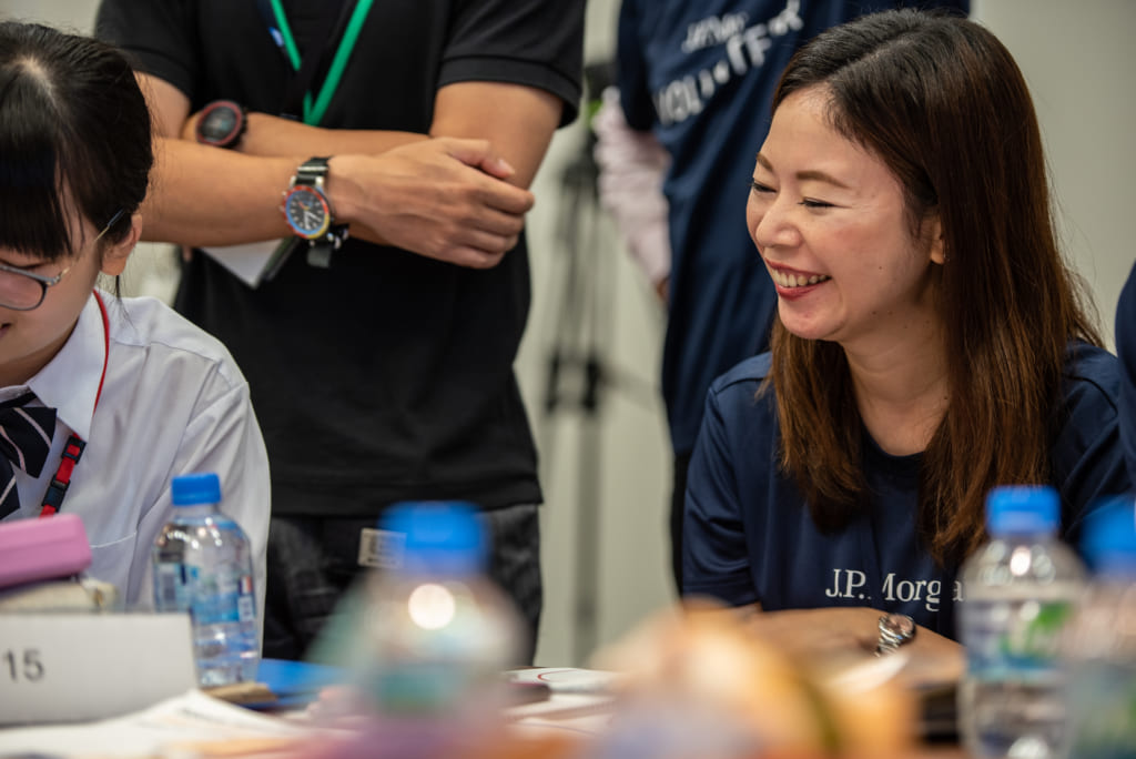 翌30日、東京・丸の内にあるJPモルガンのオフィスには大勢の生徒が集まり、高層階の大ホールは活気付いた。JPモルガンからは約60人の社員がメンター(相談相手)としてこのプログラムに加わった。生徒たちはこの日、約6カ月にわたるスクール・チャレンジを前に、考え方の練習を行う「Design Thinking Workshop」に参加した。