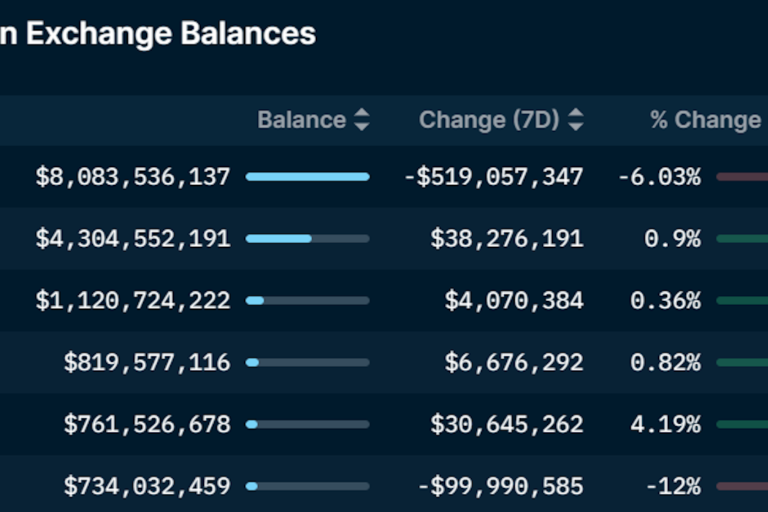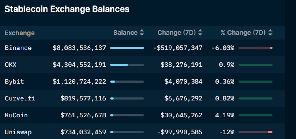 一見すると驚異的な純流出があり、その勢いは衰える気配がないにもかかわらず、Nansenのデータはバイナンスのステーブルコイン残高が健全であることも示している。同取引所のステーブルコイン残高は現在80億ドル(約1兆1200億円)強で、直近7日間の流出額は5億1900万ドル(約723億7500万円)、保有額のおよそ6%に相当する。次に保有量が多い取引所であるOKXは40億ドル(約5580億円)の残高がある。