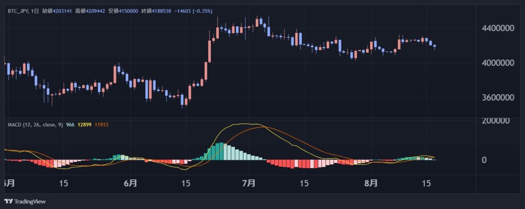 ゴールデンクロスが発生、直後に上昇したが、その後は両線とも横ばいで方向感出ていない。
