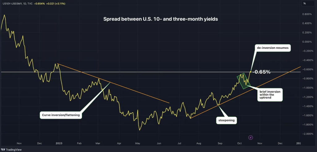 これは米国債市場からの明らかなシグナルによるもので、10年物と3カ月物の利回りの差が債券市場用語でディスインバージョン(スティープ化)と呼ばれる動きで、ゼロに向かって回復を再開している。