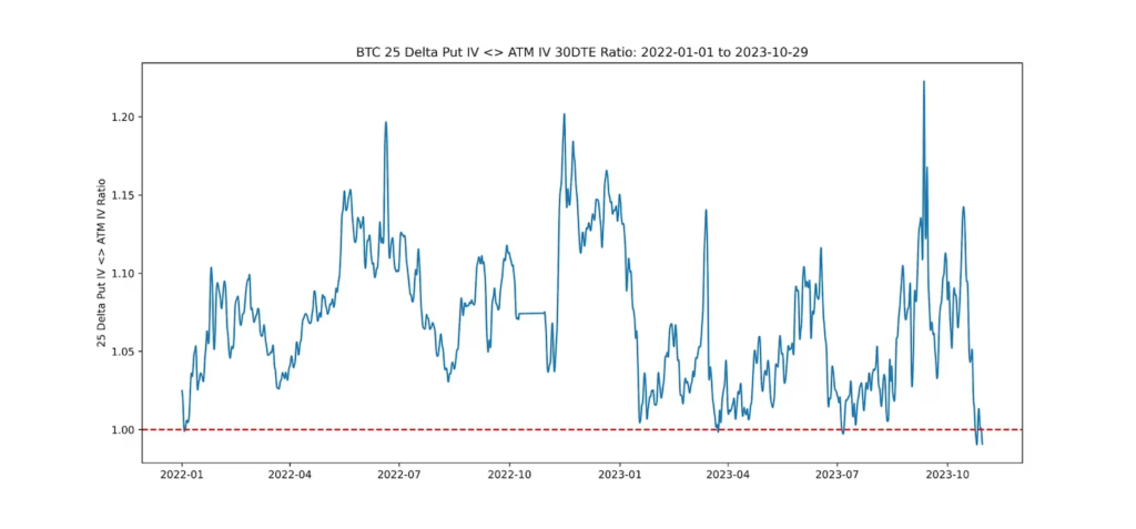 この結論は、25デルタのアウト・オブ・ザ・マネー(OTM、権利行使した時に損失が発生する状態)のBTCプットオプションのインプライド・ボラティリティ(IV)と、アット・ザ・マネー(ATM、原資産の価格と権利行使価格が同じ状態)オプションの30日IVという2つの指標の比率に基づいている。アンバーデータ(Amberdata)のデータによると、この比率は1.00を下回っている。