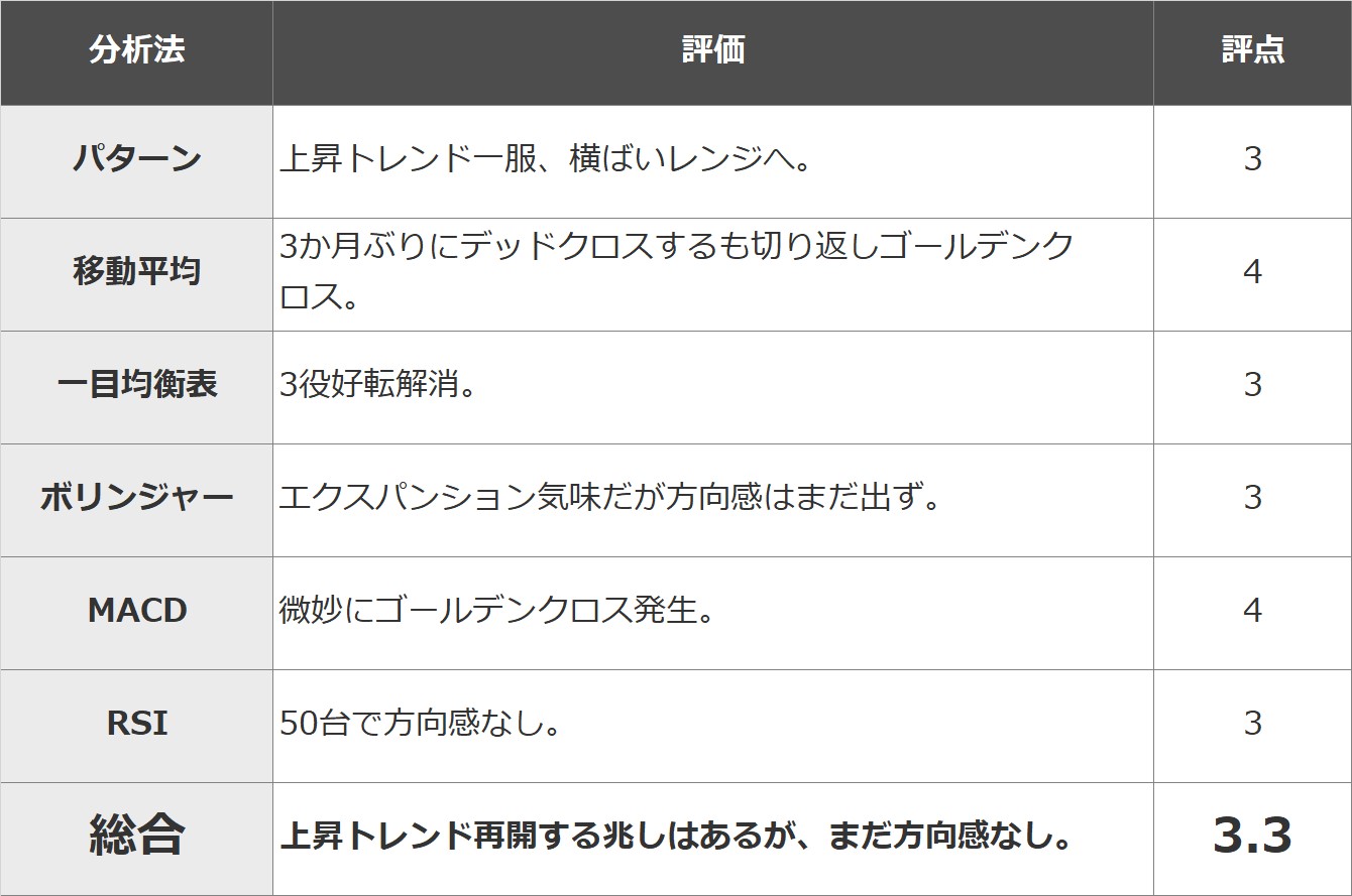 総合評点は3.3。上昇トレンド一服し、横ばいレンジに入った。上昇トレンドの再開を示唆するものも出ているが、まだ確証は持てない。現物ETFの承認の可否という大きな材料を控え、相場は方向感を見極めようとしているようにも見える。