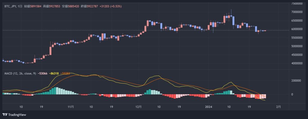 なお、こちらでは楽天ウォレットの証拠金取引所のBTCJPYのチャートを使用しております。BTCUSD のチャートはこちらご参照ください(リンク先はTradingView社のサイトです)。